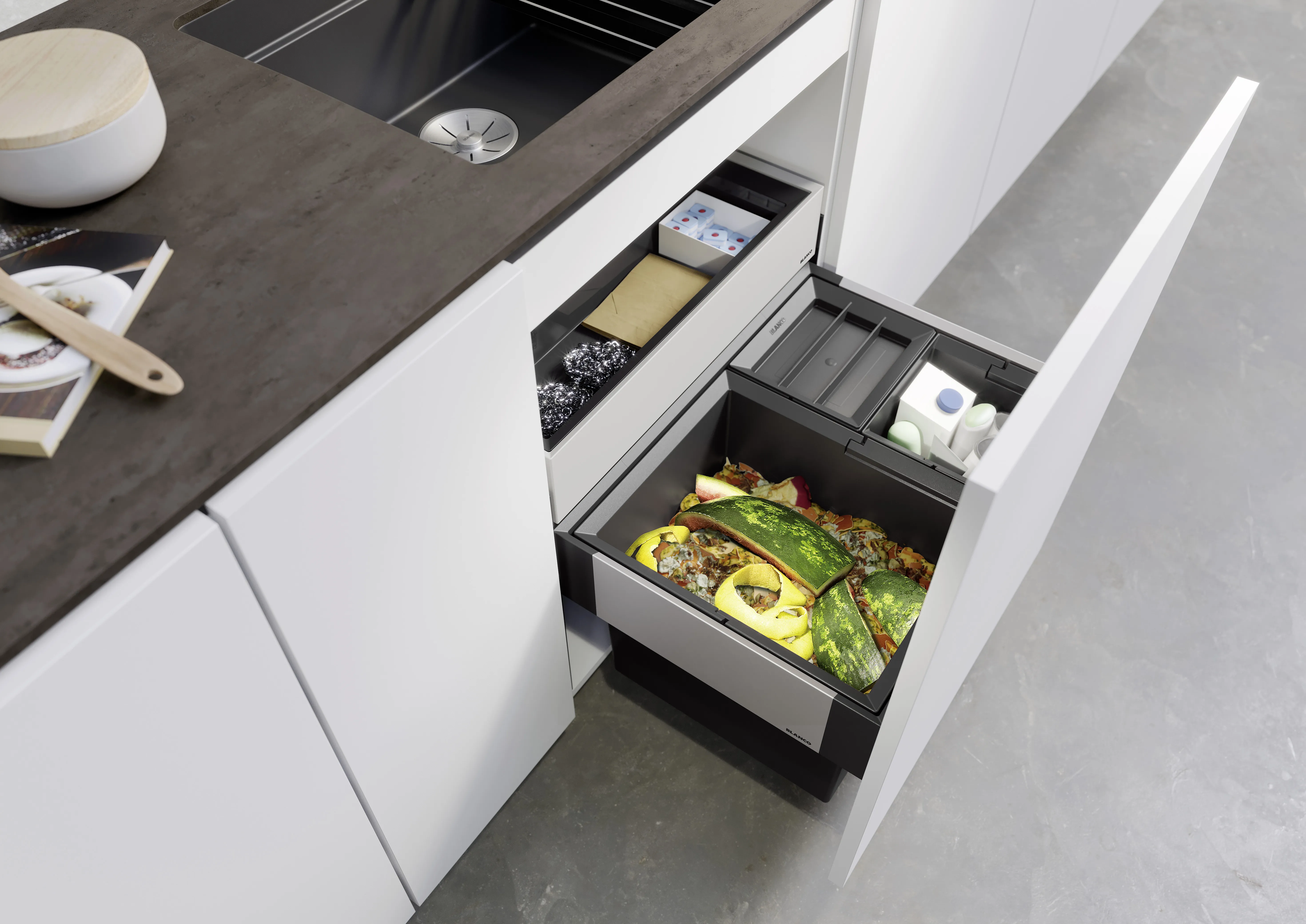 - Komplette Raumnutzung des Spülenunterschranks dank maßlich abgestimmter Lösungen, im Einklang mit Spüle und Armatur