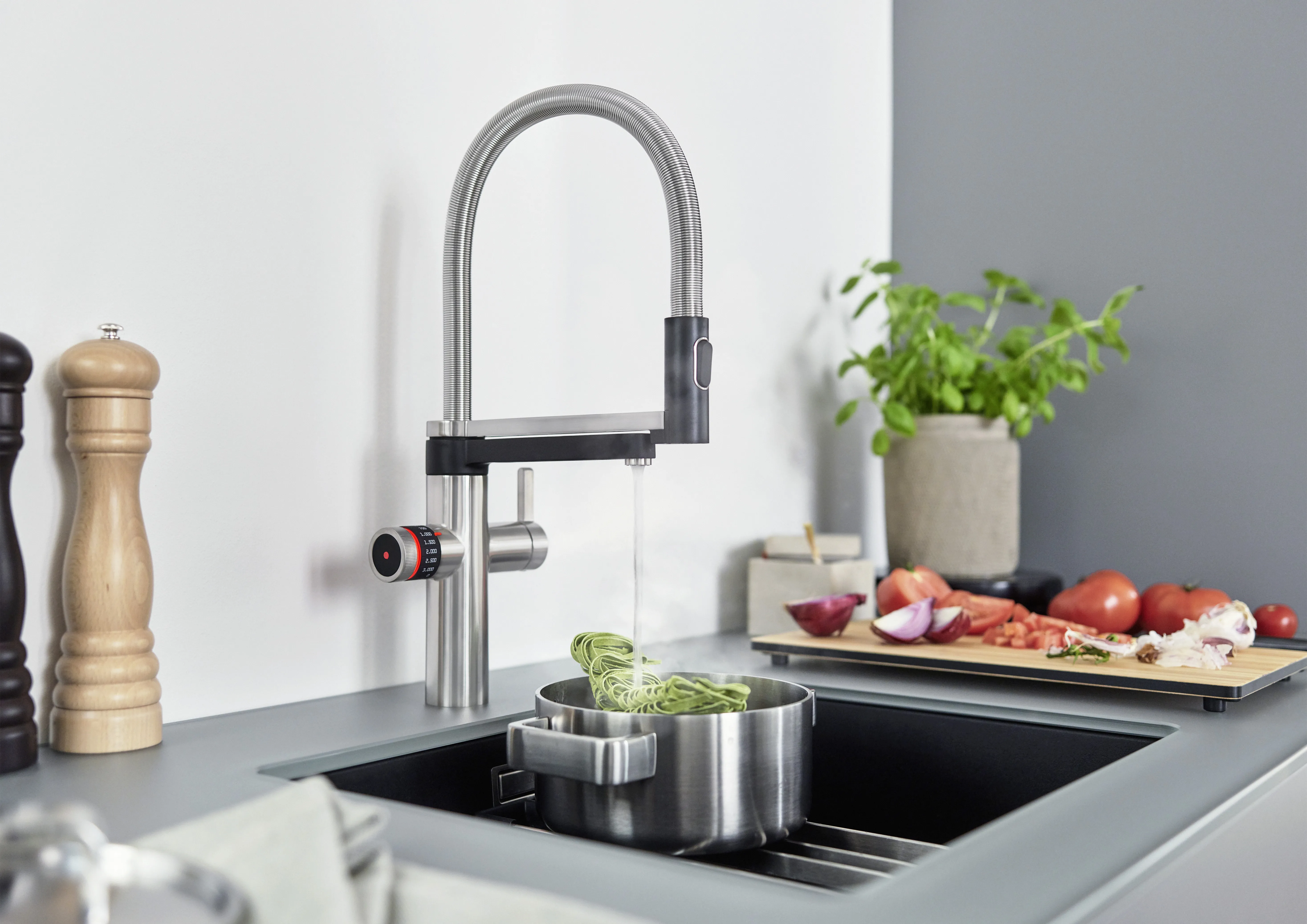- Click & Touch: Einstellung der gefilterten Wassermenge dank präzisem Drehrad und intuitive Touch-Bedienung für bedarfsgerechten Wasserverbrauch