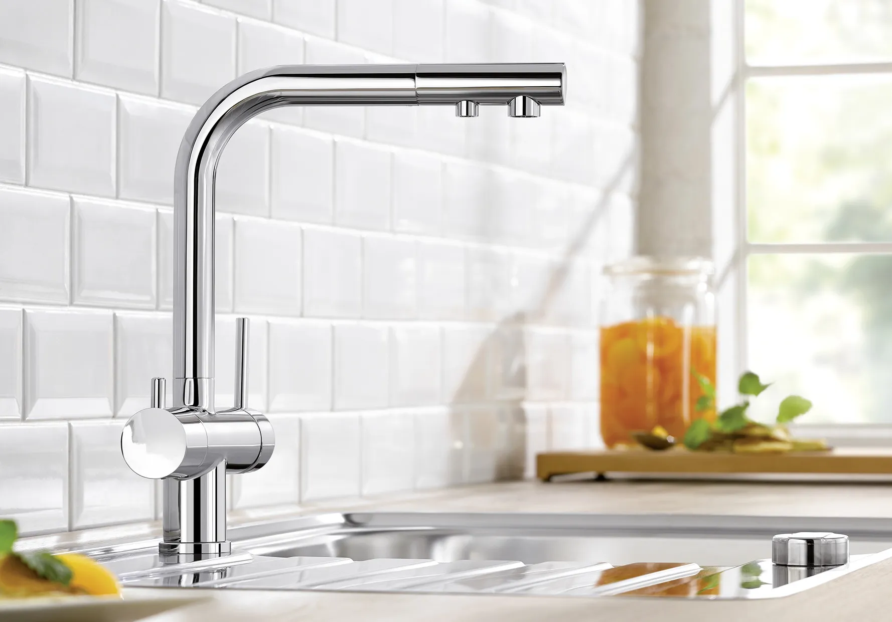 - Komfortable 3-in-1-Armatur mit Mischhebel rechts für Kalt- und Warmwasser sowie Drehgriff links für gefiltertes Wasser
