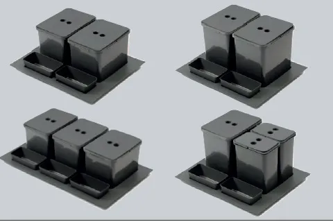 Ausgestattet mit anpassbarer Bodenplatte, Utensilien-Schalen und Eimern mit Einzeldeckeln.