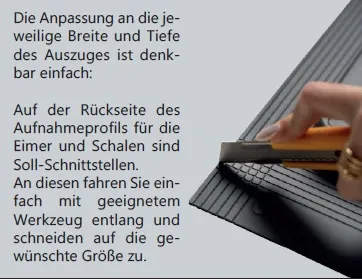Die Anpassung an die jeweilige Breite und Tiefe des Auszuges ist denkbar einfach: Auf der Rückseite des Aufnahmeprofils für die Eimer und Schalen sind Soll-Schnittstellen. An diese fahren Sie einfach mit einem geeigneten Werkzeug entlang und schneiden auf die gewünschte Größe zu.