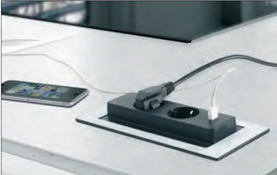Energiebox in den Ausführungen Edelstahl, lackiert oder Glas, ausgestattet mit 2 Steckdosen und USB-Anschluss (5V/2500mA), inkl. Ladegerät.