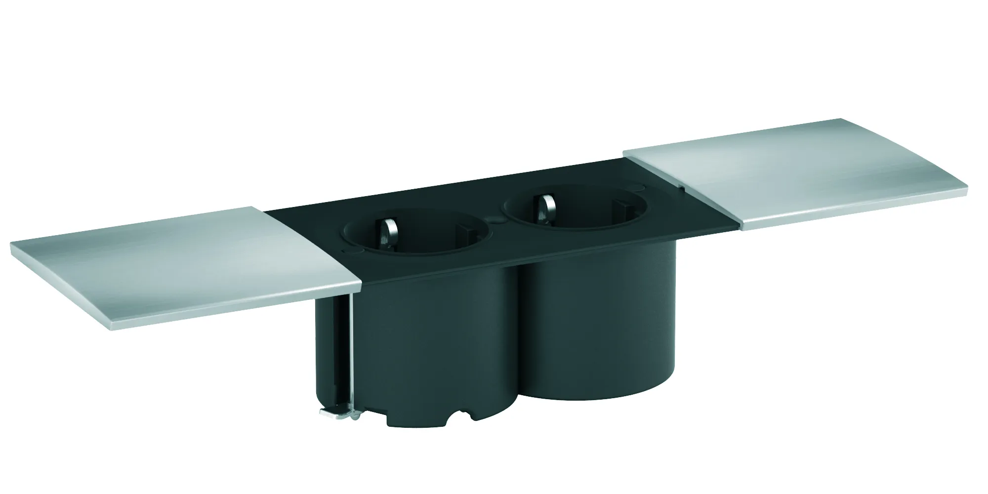 Ausführung Gehäuse hinter den Blenden in schwarz mit optional verschiebbaren Abdeckungen, mit denen die Steckdosen verschlossen werden können.
