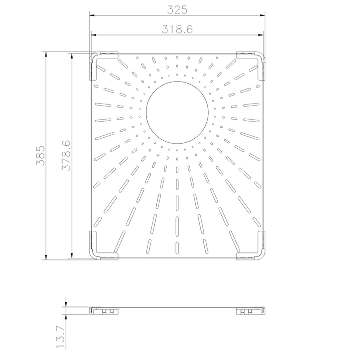 Bodengitter aus Edelstahl im "Sunbeam"-Design. Zum Schutz des Behälterbodens. Abmessungen (LxBxH): 330x390x14mm. Für die 340x400mm Gold R-Serie, Artikel 708045 und 708046.