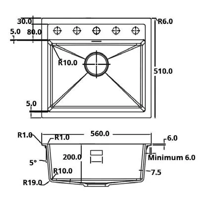 Black Line. Composite, Tiefe 200mm, inkl. Korbventil-Set mit Design-Überlauf und Klemmen. Für den Ausschnitt ist die Spüle erforderlich. Abmessungen (BxT): innen: 500x360mm, Außen: 560x510mm.