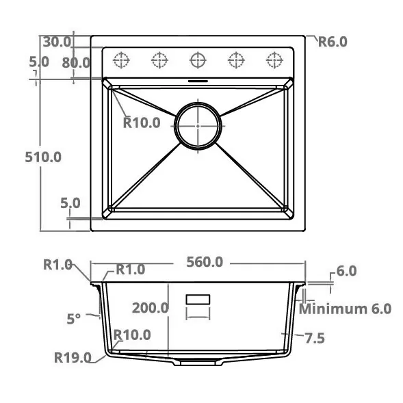 White Line Composite, Tiefe 185mm, inkl. Korbventil-Set mit Design-Überlauf und Klemmen. Für den Ausschnitt ist die Spüle erforderlich. Abmessungen (BxT): innen: 500x360mm, Außen: 560x510mm.