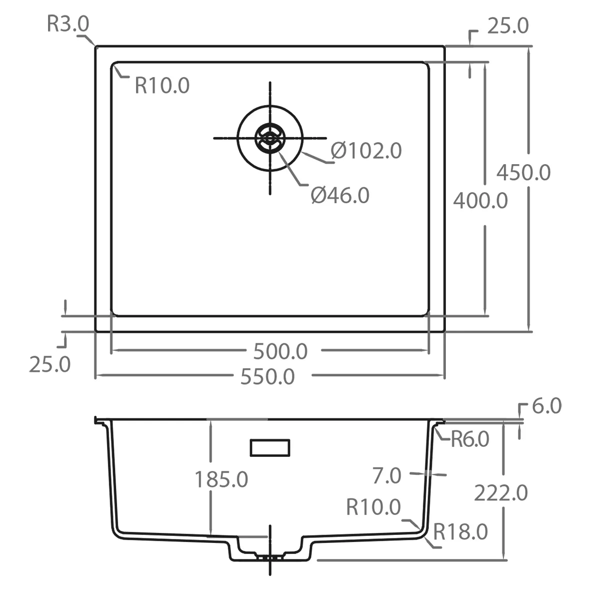 Black Line. Composite, Tiefe 185mm, inkl. Korbventil-Set mit Design-Überlauf und Klemmen. Für den Ausschnitt ist die Spüle erforderlich. Abmessungen (BxT): innen: 500x400mm, Außen: 550x450mm.