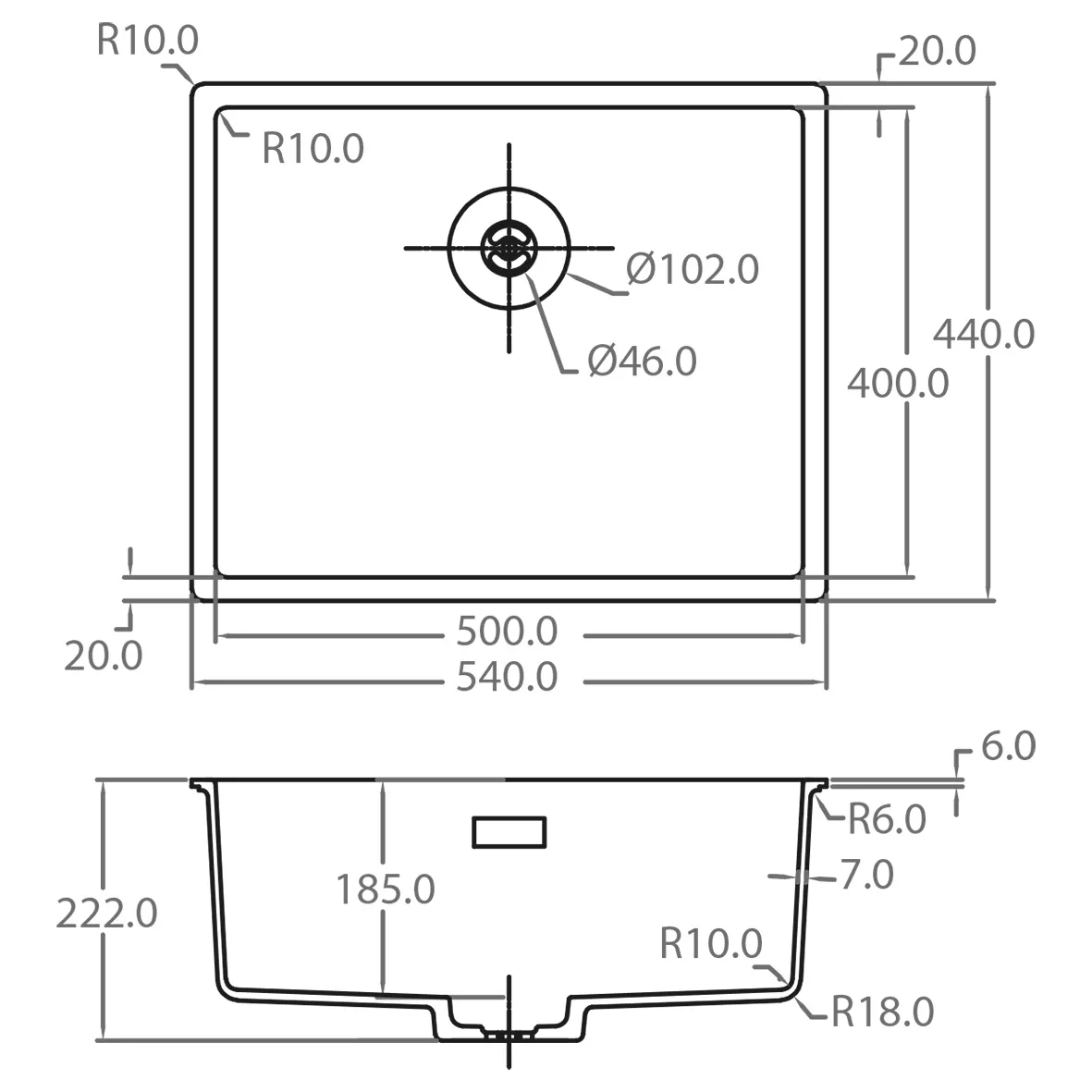 Black Line. Composite, Teife 185mm, inkl. Korbventil-Set mit Design-Überlauf und Klemmen. Abmessungen (BxT): innen: 500x400mm, Außen EiN: 534x434mm, Außen TU: 550x450mm.
