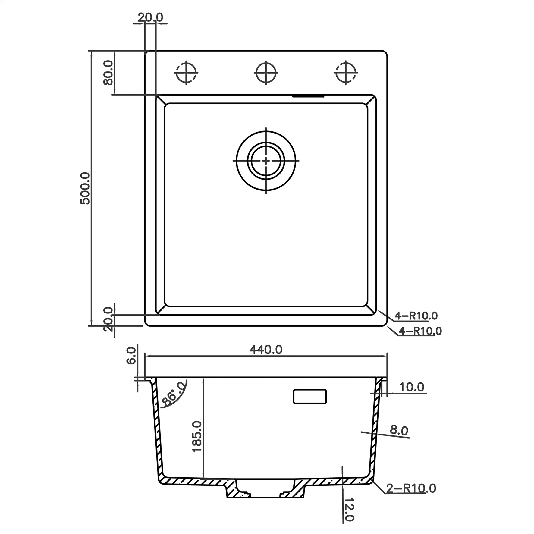 Black Line. Quartz Composite, Tiefe 185mm, inkl. KorbstopfenSatz mit Design-Überlauf und Klemmen. Für den Ausschnitt ist die Spüle erforderlich. Abmessungen (BxT): innen: 400 x 400mm, außen: 440 x 500mm.