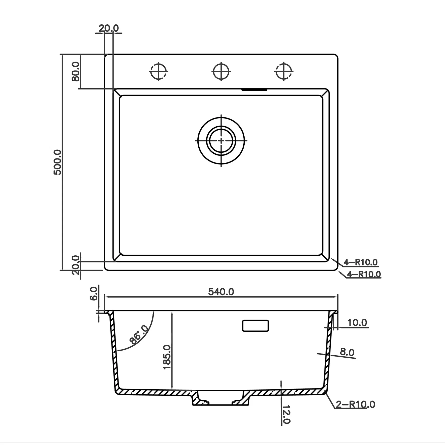 Black Line. Quartz Composite, Tiefe 185mm, inkl. KorbstopfenSatz mit Design-Überlauf und Klemmen. Für den Ausschnitt ist die Spüle erforderlich. Abmessungen (BxT): innen: 500 x 400mm, außen: 540 x 500mm.