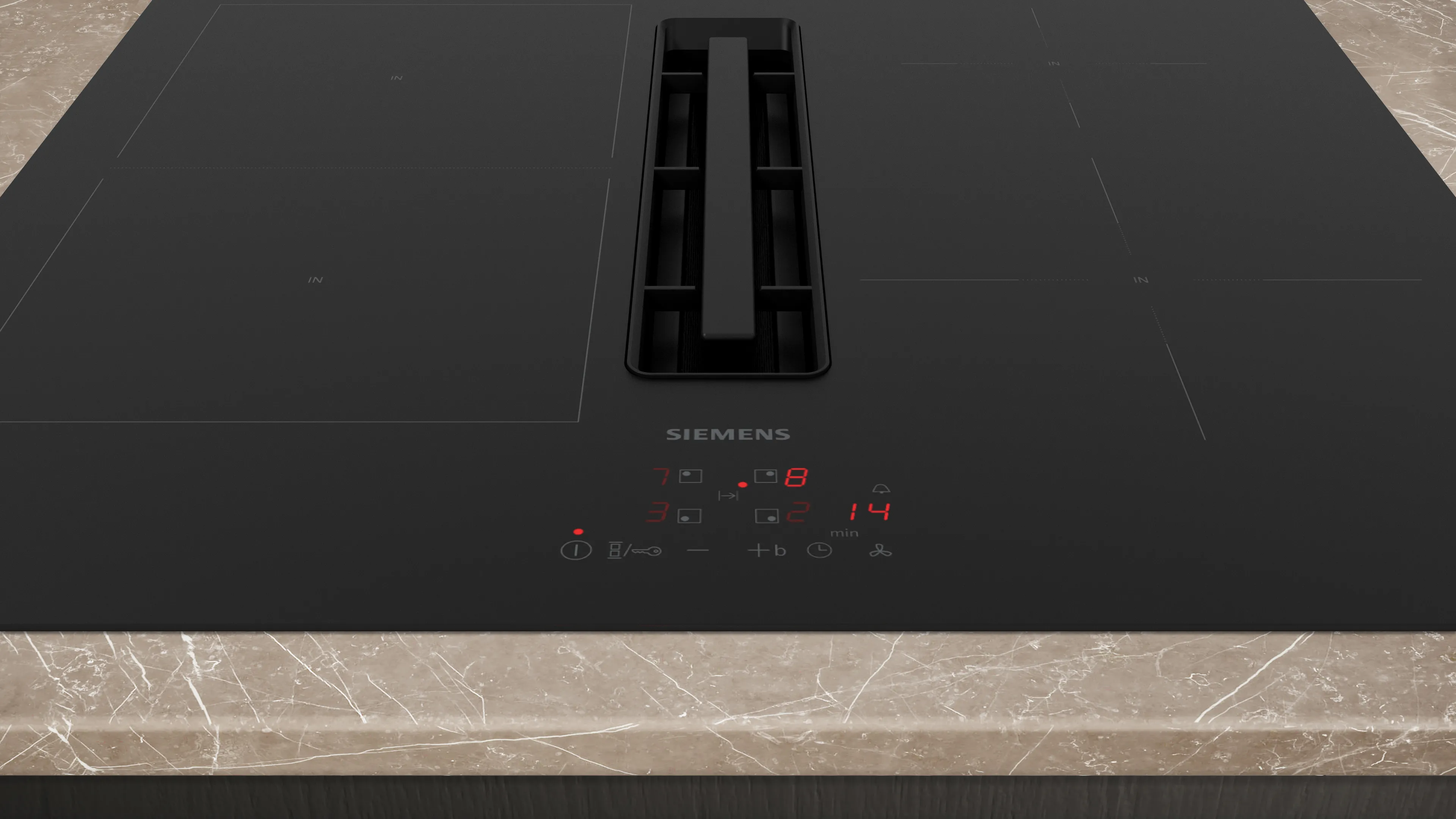 Induktionskochfeld mit vollintegriertem, leistungsstarkem Downdraft-Abzugsmodul.