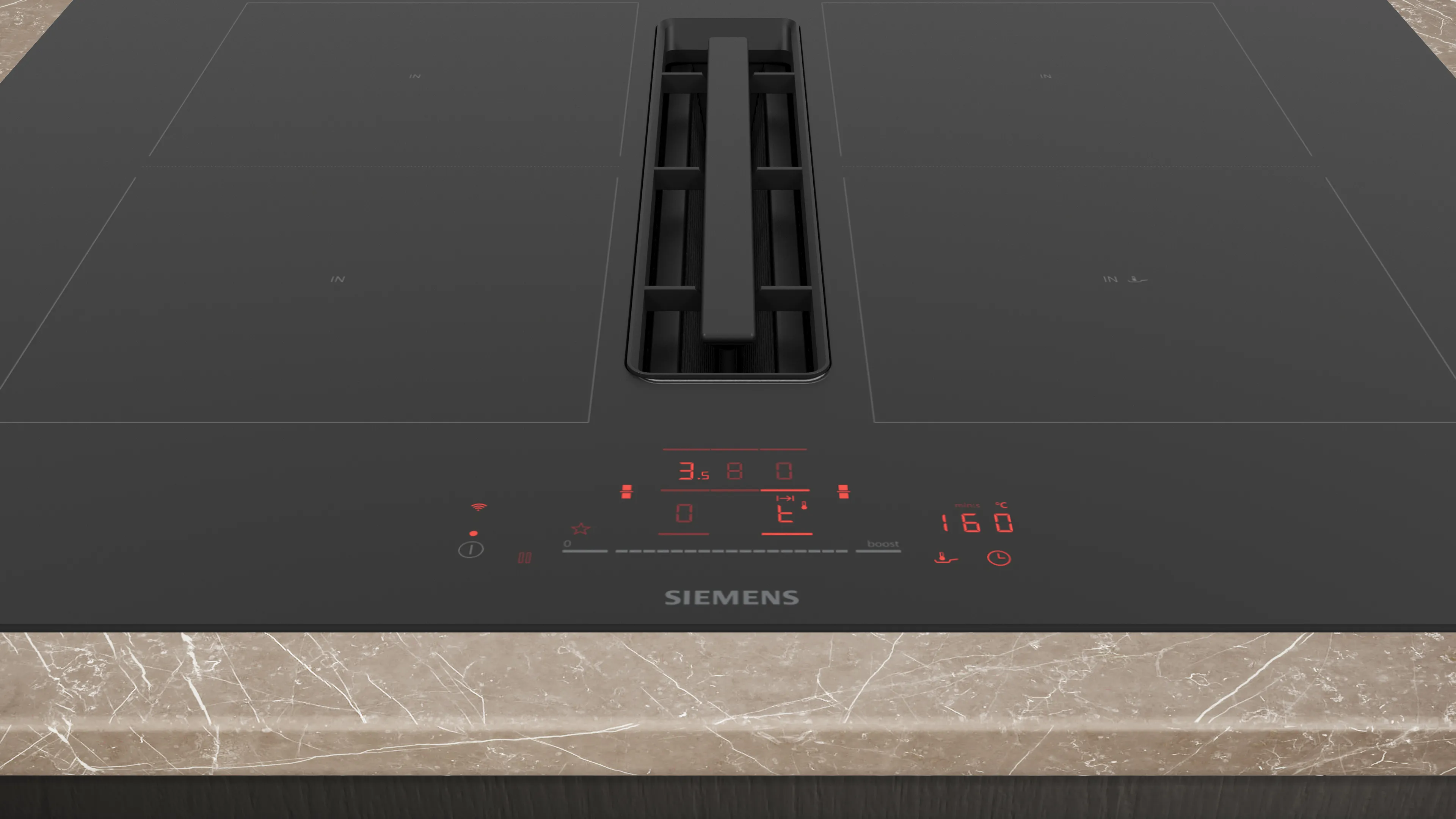 Induktionskochfeld mit vollintegriertem, leistungsstarkem Downdraft-Abzugsmodul.