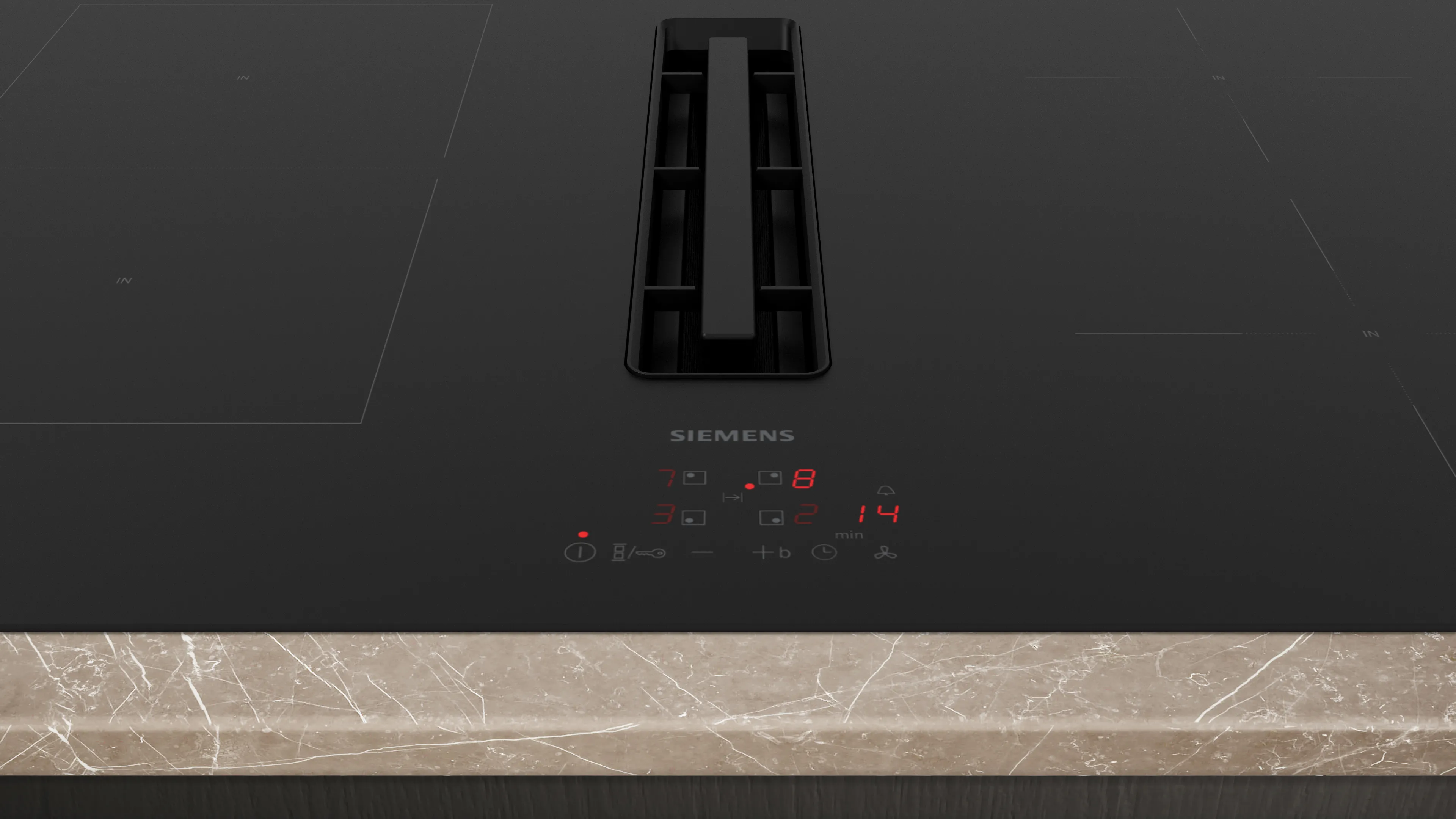Induktionskochfeld mit vollintegriertem, leistungsstarkem Downdraft-Abzugsmodul.