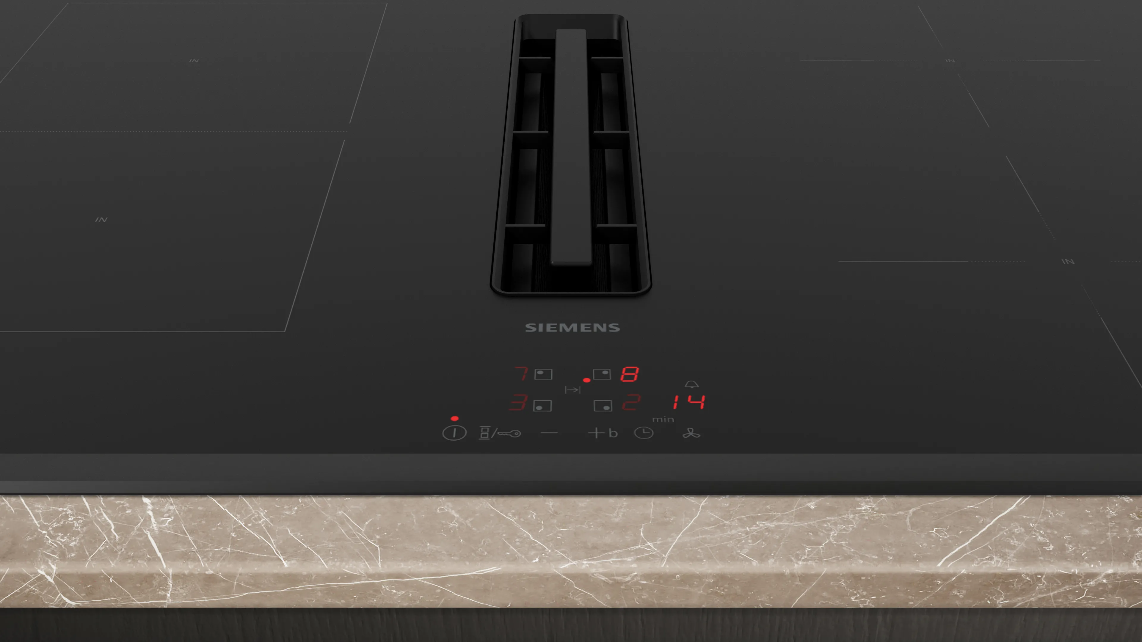 Induktionskochfeld mit vollintegriertem, leistungsstarkem Downdraft-Abzugsmodul.
