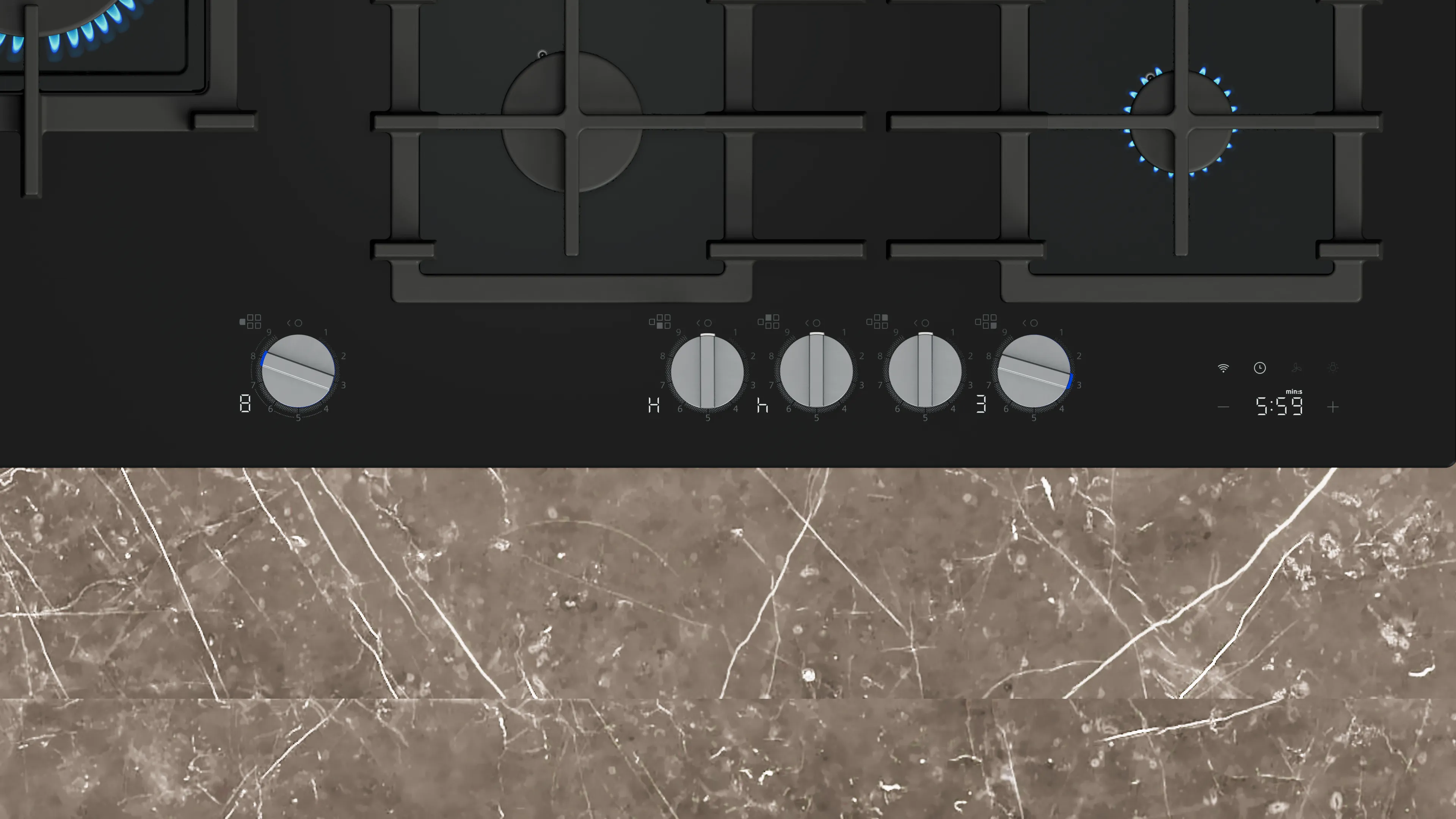 Restwärmeanzeige 5-fach: zeigt an, welche Brennerteile und Pfannenträger noch heiß sind.