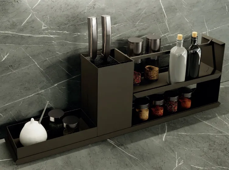 Freistehend oder im Grundtablett fixiert sorgen die Elemente für eine aufgeräumte Arbeitsfläche und stets griffbereites Kochzubehör - in elegantem Sepia-Braun, metallic.