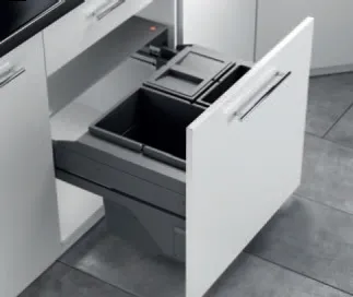 Selbsttragendes Abfallsystem, selbstjustierend für Seitenwände von 16 mm bis 19 mm und übertiefe Vollauszüge.