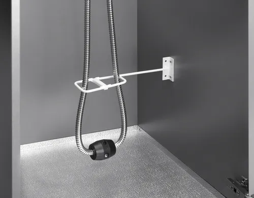 Der Schlauchbrause-Abweiser führt den Armaturenschlauch der Brause. Dadurch liegt das Gewicht des Brauseschlauchs nicht mehr auf dem Abfallsammler und behindert so nicht mehr den Schlaucheinzug.
