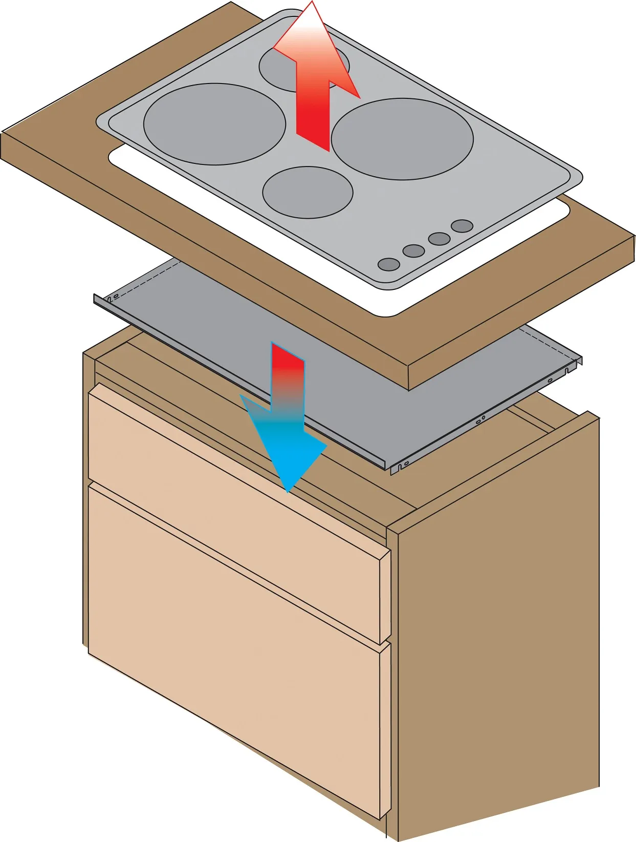 Ein Hitzeschutzboden ist empfehlenswert für jeden Auszug/jede Schublade unter einem Kochfeld. Er wird unter dem Kochfeld im Schubladenbereich montiert, leitet die Wärmeabstrahlung nach hinten und schützt vor Hitze und gleichzeitig vor Beschädigung des Kochfeldes (bzw. der unten liegenden Technik) durch Utensilien in der Schublade.