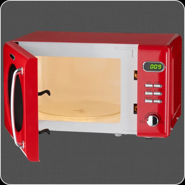Kunststoff rot lackiert, Garraum Weiß lackiert, 20 Liter Volumen, 700 Watt Maximale Leistung, 5 Leistungsstufen, Auftaufunktion, Endsignal, Griff, Drehteller 24,50 cm