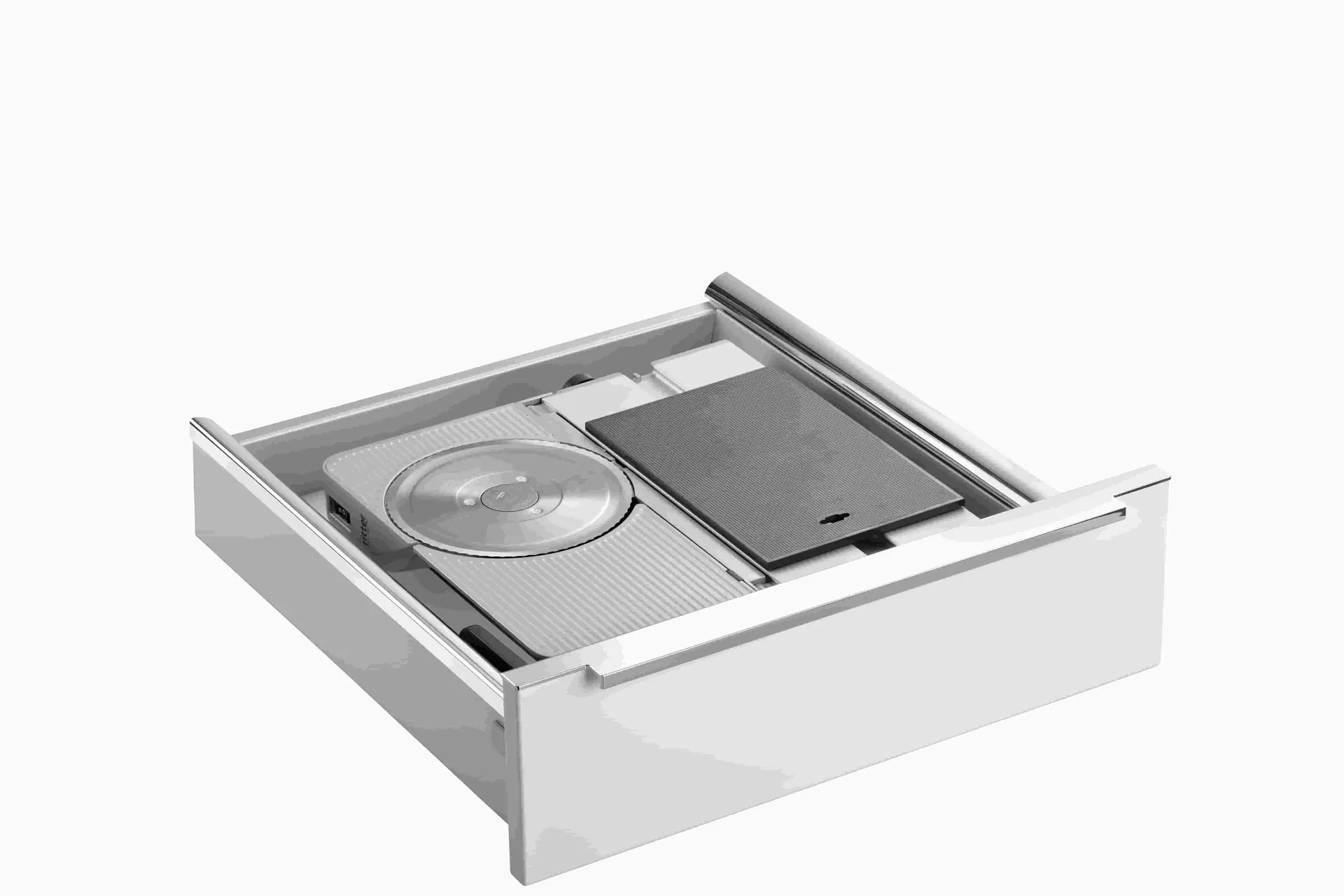 In Küchenschubladen eingebaute Allesschneider sind platzsparend und dabei doch immer griffbereit. Die Einbaulösung schafft zudem noch Platz auf der Arbeitsplatte.