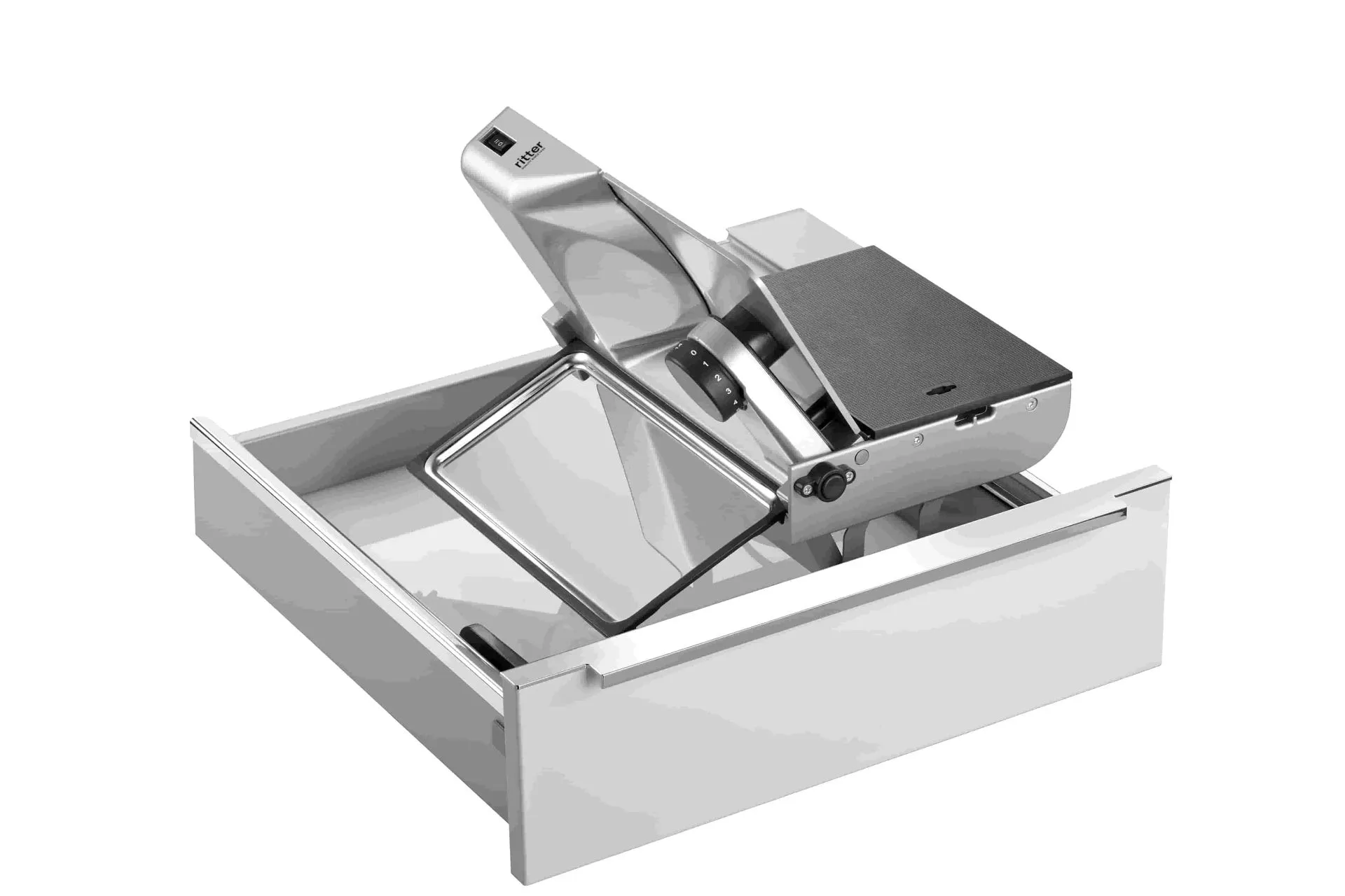Einbau-Allesschneider mit Zuführung rechts zum Einbau und Montage in Normschubladen ab 50 cm Korpusbreite. Klappbar und trotzdem stabil!