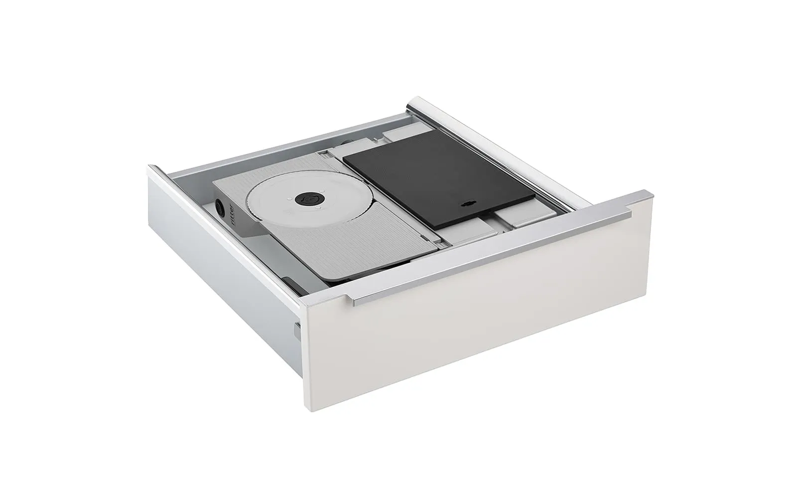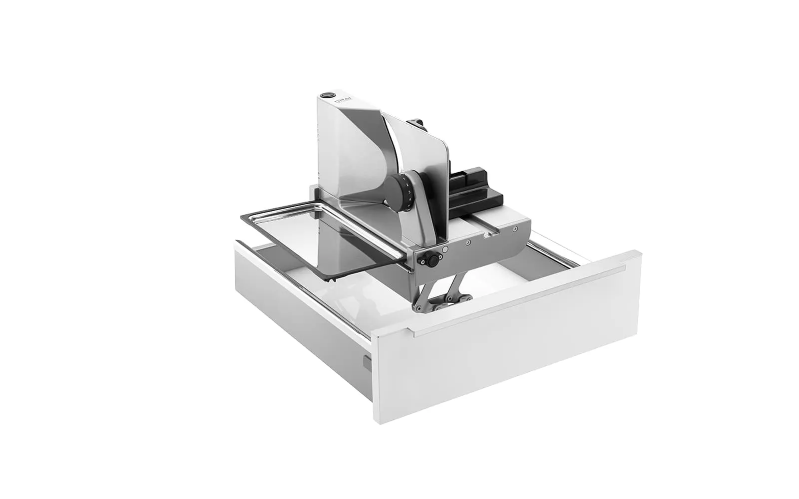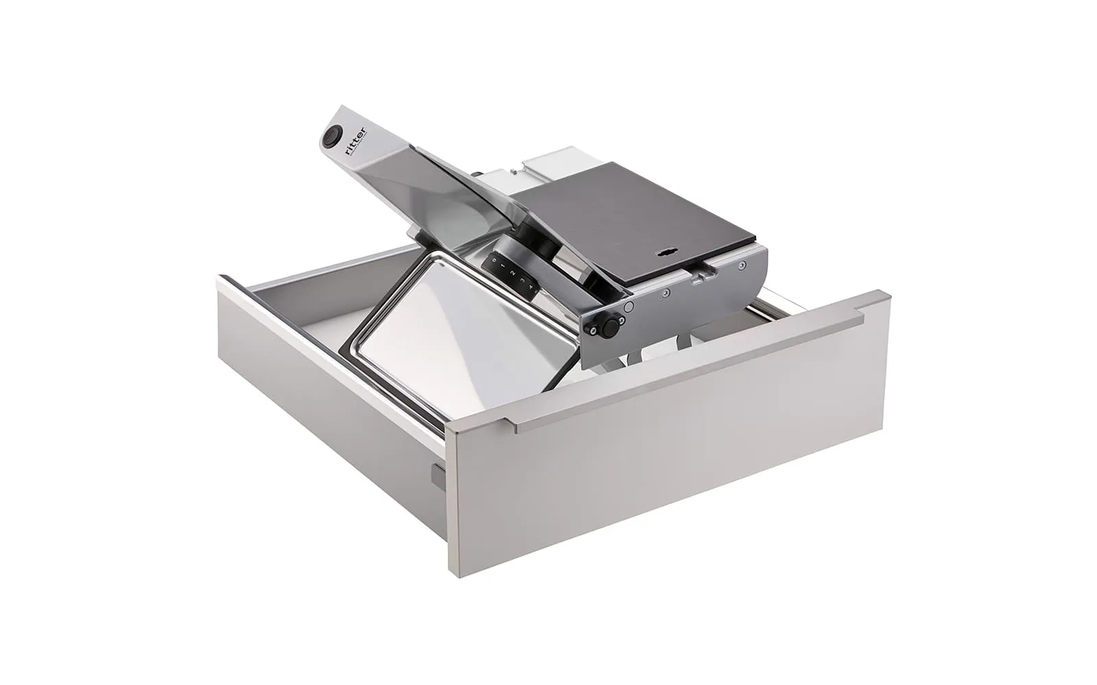 In Küchenschubladen eingebaute Allesschneider sind platzsparend und dabei doch immer griffbereit. Die Einbaulösung schafft zudem noch Platz auf der Arbeitsplatte.