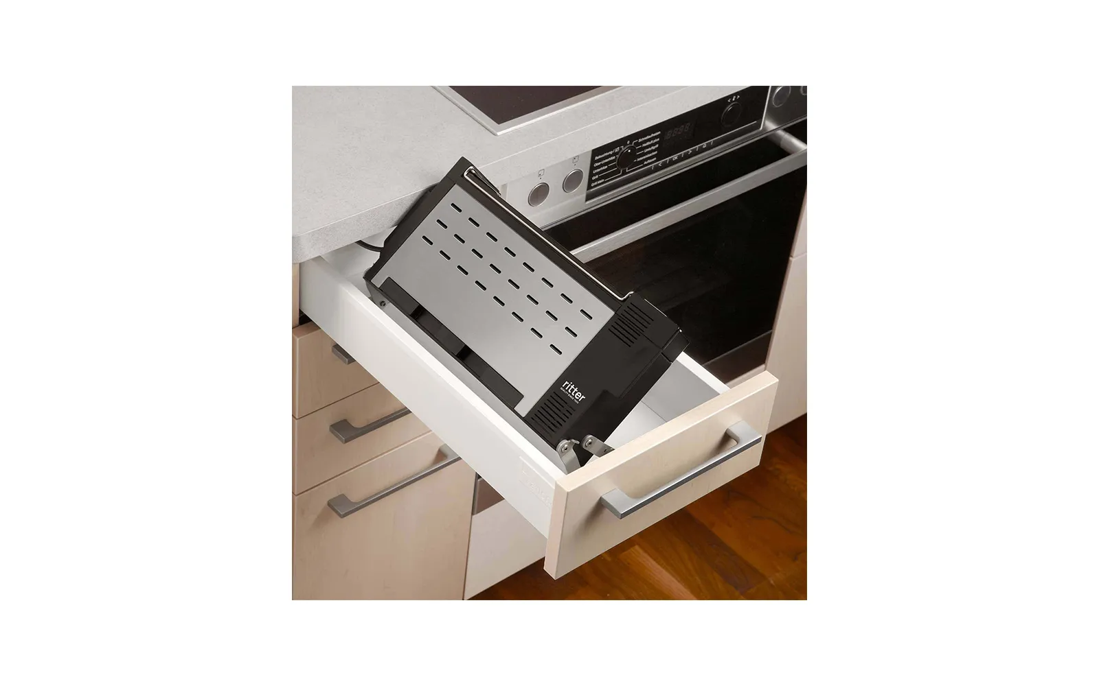 Fest im Schubkasten montiert und mit einem Handgriff einsatzbereit. Anschließend umklappen und Schubkasten schließen. Sicherheit durch wärmeisoliertes Gehäuse und automatische Abschaltung beim Einklappen des Gerätes.