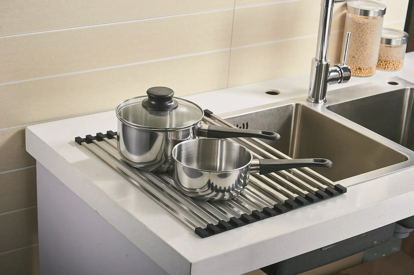 Die vielseitige Edelstahl-Matte mit hochwertigen Einfassungen rundet das universelle Spülen-Zubehörprogramm ab.
