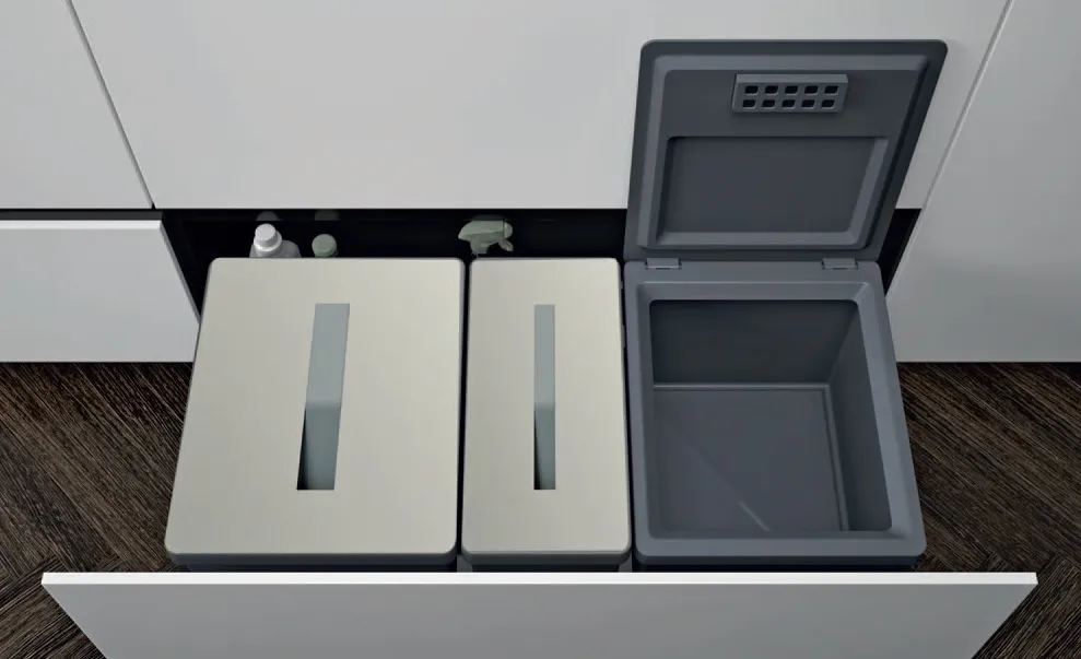 Deckel-Oberteil in der Farbe Titanum, Eimer und Auszugs-Einsatz in zeitgemäßem, dunklen Oriongrau.